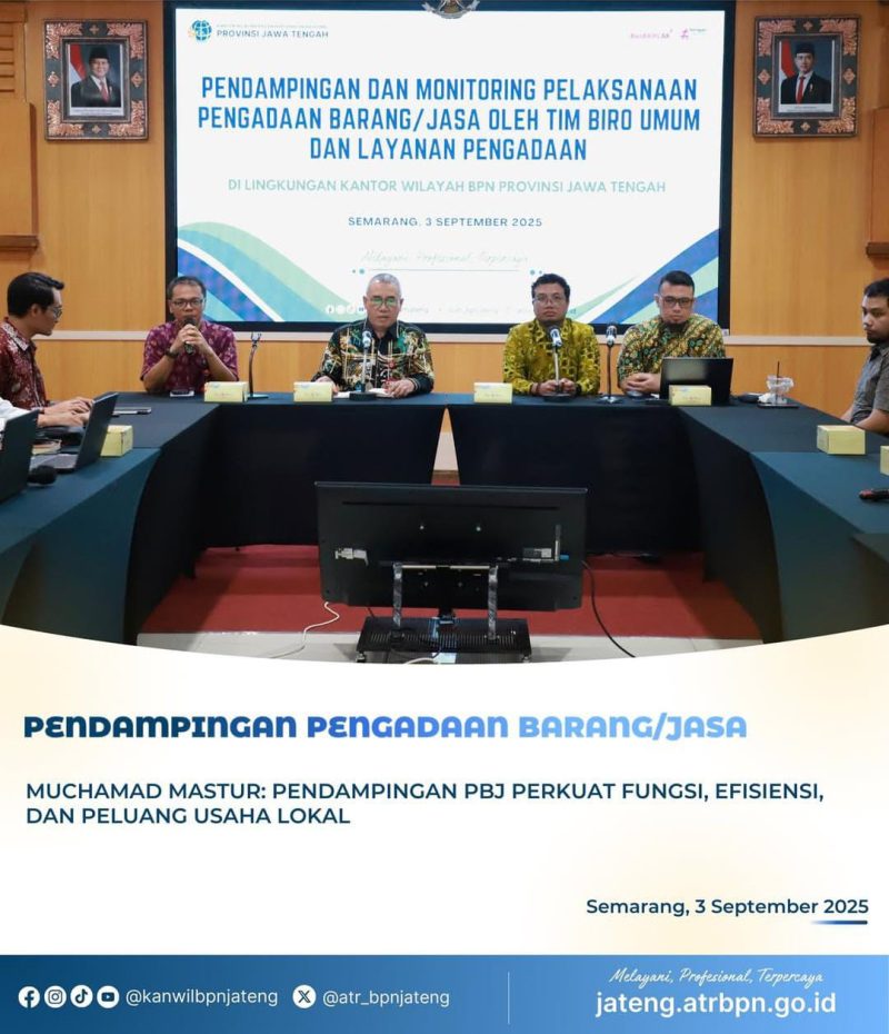 Semarang – Kanwil BPN Provinsi Jawa Tengah menggelar Kegiatan Pemdampingan dan Monitoring Pelaksanaan Pengadaan Barang/Jasa pada Rabu, 3 September 2025. Kegiatan yang dilaksanakan di Aula Sentosa Kanwil BPN Jateng ini berlangsung secara hybrid (luring dan daring), dengan menghadirkan pejabat terkait dari seluruh Kantor Pertanahan Kabupaten/Kota se-Jawa Tengah.