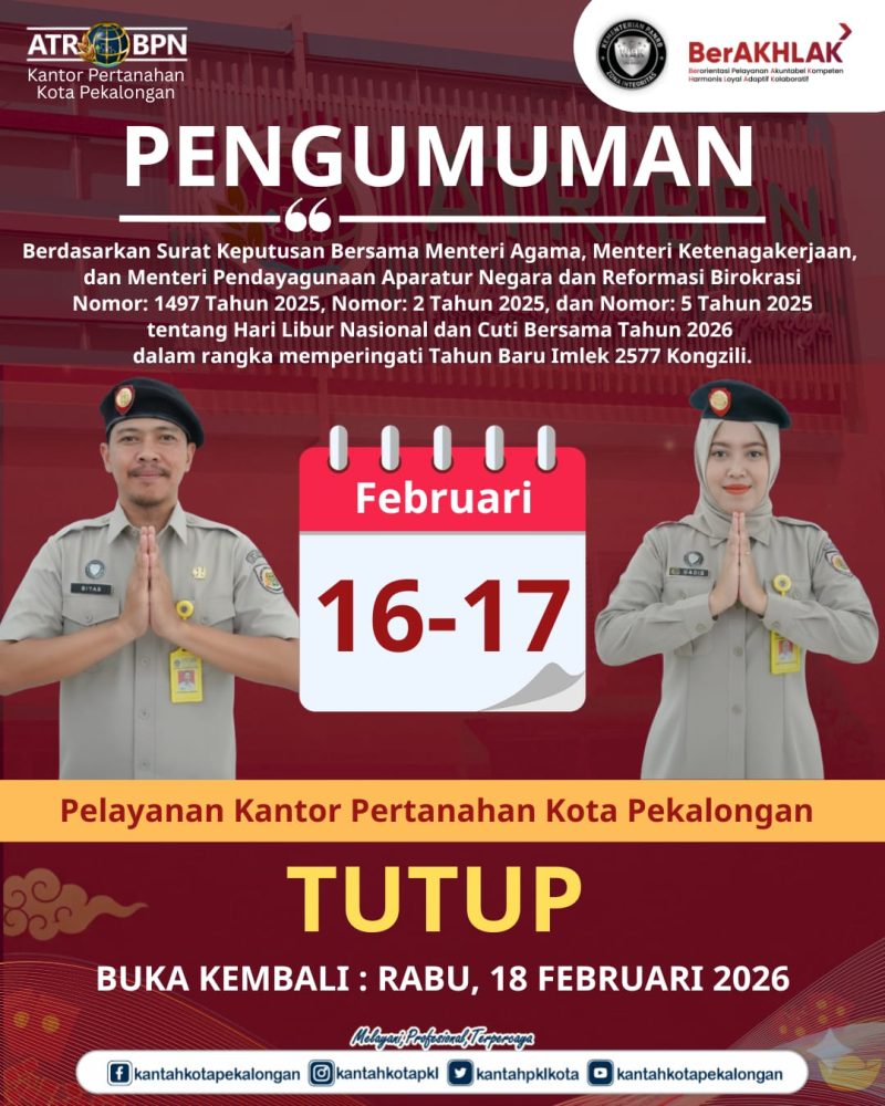 Pelayanan pada Kantor Pertanahan Kota Pekalongan Senin, 16 s.d Selasa, 17 Februari 2026 TUTUP.