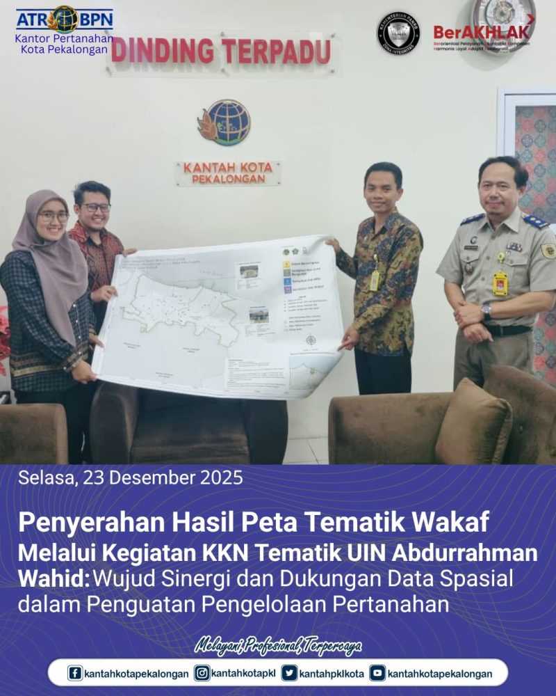 Perwakilan SPPR Direktorat Tematik Kementerian Agraria dan Tata Ruang/Badan Pertanahan Nasional, Staf Direktorat Tematik melaksanakan penyerahan hasil Peta Tematik Wakaf yang disusun melalui kegiatan KKN Tematik UIN K.H. Abdurrahman Wahid (Gus Dur) kepada Kantor Pertanahan Kota Pekalongan.