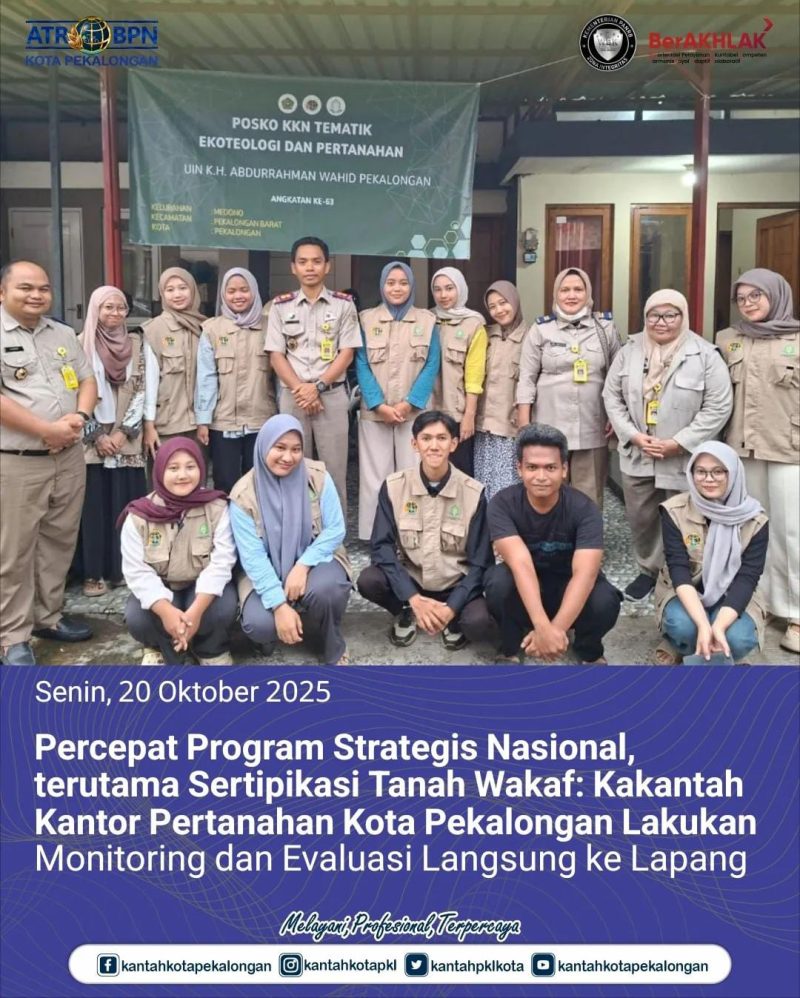 Hai #SobATRBPN pada hari Senin, 20 Oktober 2025 Komitmen Kantor Pertanahan Kota Pekalongan dalam mempercepat program strategis nasional, terutama sertifikasi tanah wakaf, diperkuat dengan kegiatan Monitoring dan Evaluasi (Monev) langsung ke lapangan. Kepala Kantor Pertanahan Kota Pekalongan, Bapak Joko Wiyono, didampingi Kepala Seksi Penetapan Hak dan Pendaftaran, Bapak Sutarno menyambangi para mahasiswa Kuliah Kerja Nyata (KKN) Tematik Etimologi dan Pertanahan dari Universitas Islam Negeri K.H. Abdurrahman Wahid Pekalongan. Kunjungan ini dilakukan secara mararton ke empat posko utama KKN yang tersebar di wilayah Pekalongan, yakni Kecamatan Pekalongan Selatan, Utara, Barat, dan Timur.