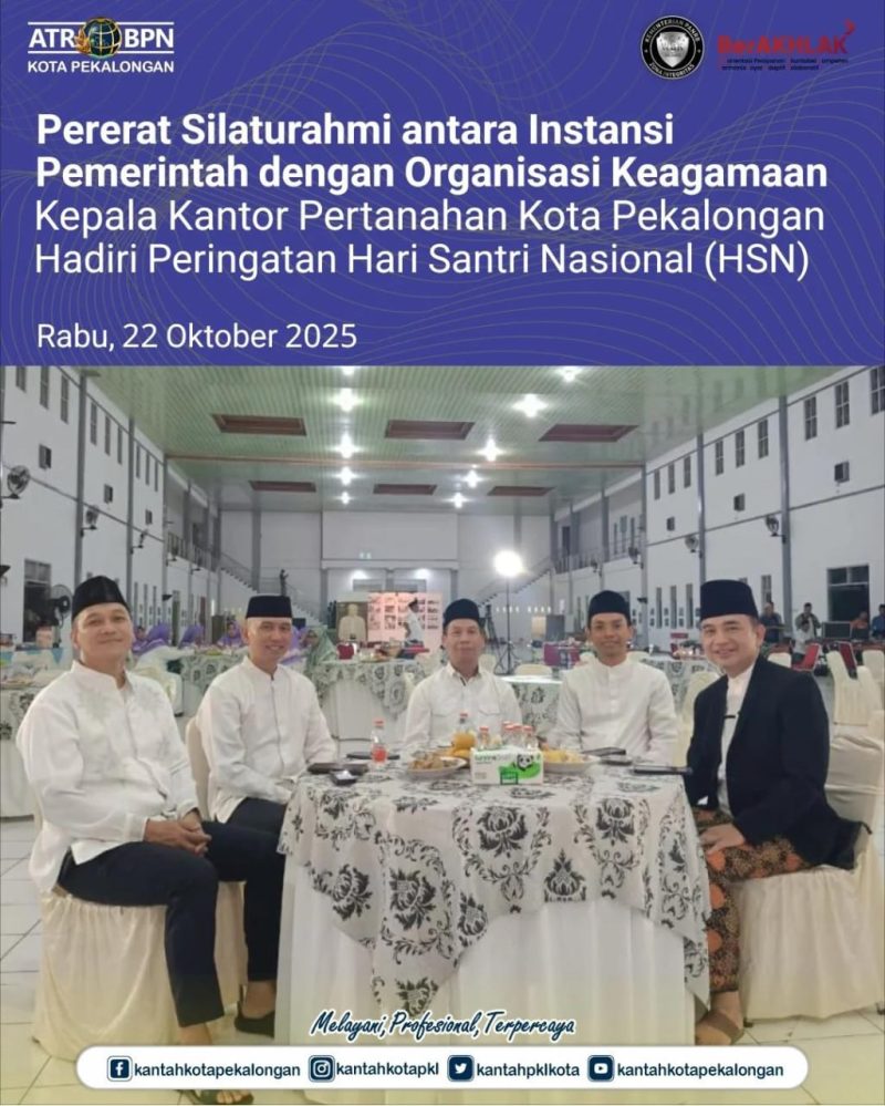 Hai #SobATRBPN pada hari Rabu, 22 Oktober 2025 Kantor Pertanahan Kota Pekalongan menunjukkan komitmennya dalam menjalin sinergi dengan berbagai elemen masyarakat, khususnya tokoh agama, dengan menghadiri peringatan Hari Santri Nasional (HSN), acara yang diselenggarakan oleh Pengurus Cabang Nahdlatul Ulama (PCNU) Kota Pekalongan bertempat di Gedung Aswaja ini menjadi momentum untuk mempererat silaturahmi antara instansi pemerintah dengan organisasi keagamaan tersebar di indonesia.