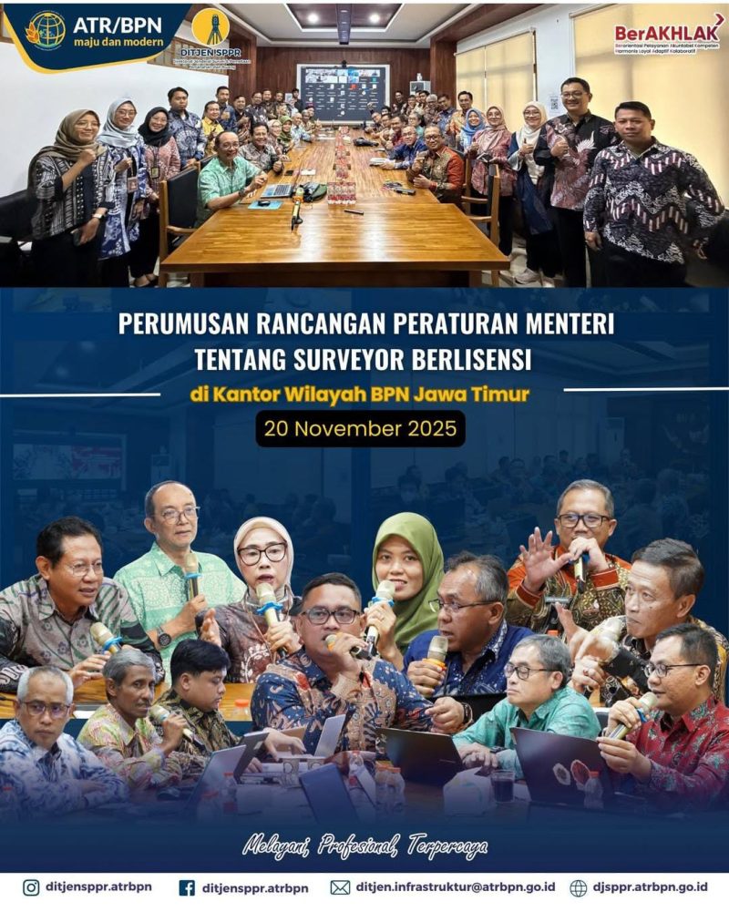 Surabaya – Telah dilaksanakan Pembahasan Rancangan Peraturan Menteri ATR/Kepala BPN tentang Surveyor Berlisensi pada (20/11) di Kantor Wilayah BPN Provinsi Jawa Timur. Kegiatan ini dilaksanakan secara hybrid dan diikuti oleh pegawai di lingkungan Kementerian ATR/BPN serta perwakilan dari Universitas Gadjah Mada (UGM), Institut Teknologi Sepuluh Nopember (ITS), Sekolah Tinggi Pertanahan Nasional (STPN), Ikatan Surveyor Indonesia (ISI), dan Masyarakat Ahli Survey Kadaster Indonesia (MASKI).
