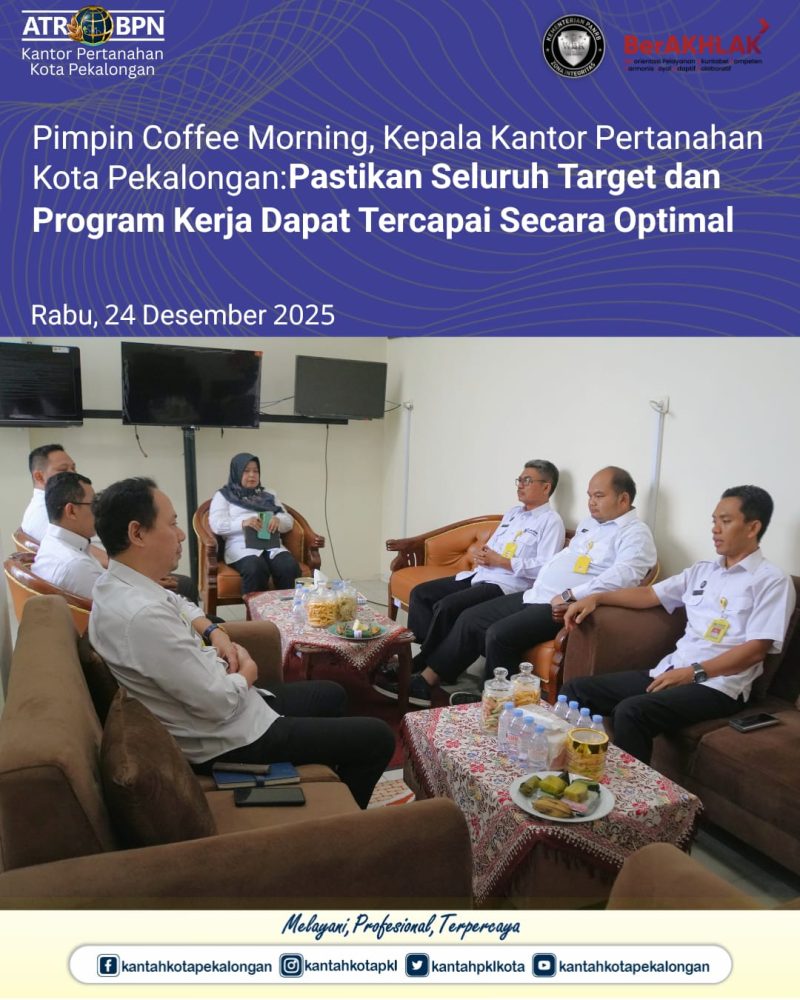 Kantor Pertanahan Kota Pekalongan melaksanakan kegiatan Coffee Morning yang dipimpin langsung oleh Kepala Kantor Pertanahan Kota Pekalongan, Bapak Joko Wiyono. Kegiatan yang berlangsung di Ruang Dindu Kantah Kota Pekalongan pada Rabu pagi ini dihadiri oleh seluruh Pejabat Pengawas.