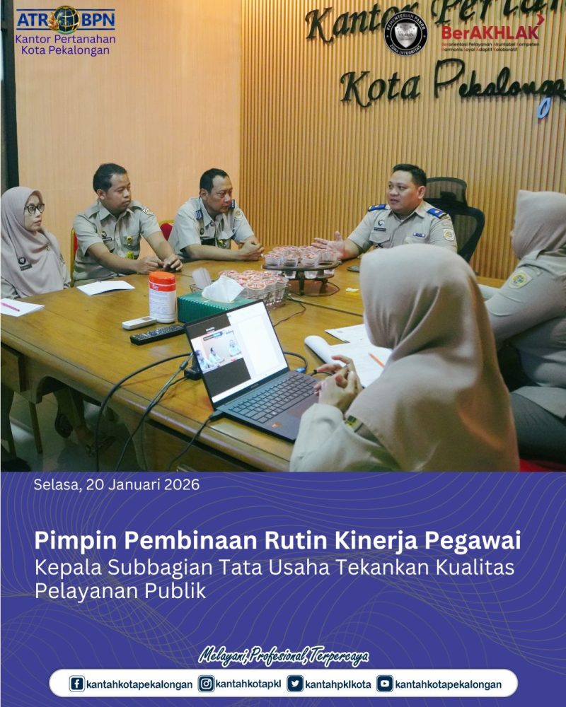 Selasa, 20 Januari 2026 Mengawali langkah di tahun 2026, Kantor Pertanahan Kota Pekalongan terus berkomitmen meningkatkan kualitas pelayanan publik. Kepala Subbagian Tata Usaha, Bapak Dwi Suprastyo, memimpin langsung kegiatan Pembinaan Rutin Kinerja Pegawai yang ditujukan bagi jajaran petugas loket dan bagian arsip.