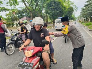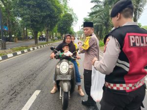 Selain berbagi takjil, personel juga mengimbau masyarakat agar tetap tertib berlalu lintas serta mengutamakan keselamatan selama berkendara.