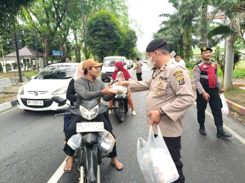 Memasuki hari ke-24 bulan suci Ramadhan 1447 H, Polres Langkat melaksanakan kegiatan bakti sosial dengan membagikan takjil kepada masyarakat, Sabtu (14/3/2026) sore.