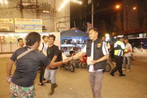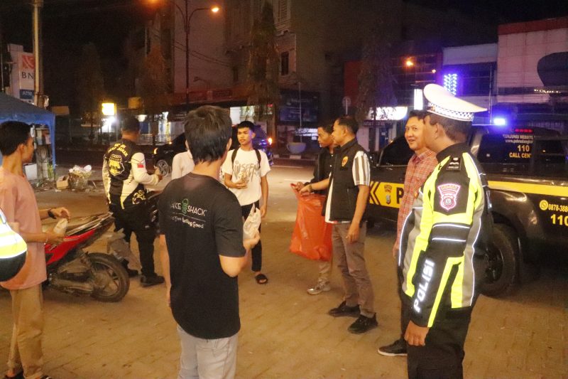 Selain berbagi makanan, petugas juga memberikan imbauan kepada masyarakat agar tetap tertib berlalu lintas serta mengutamakan keselamatan selama berkendara, khususnya di waktu dini hari.