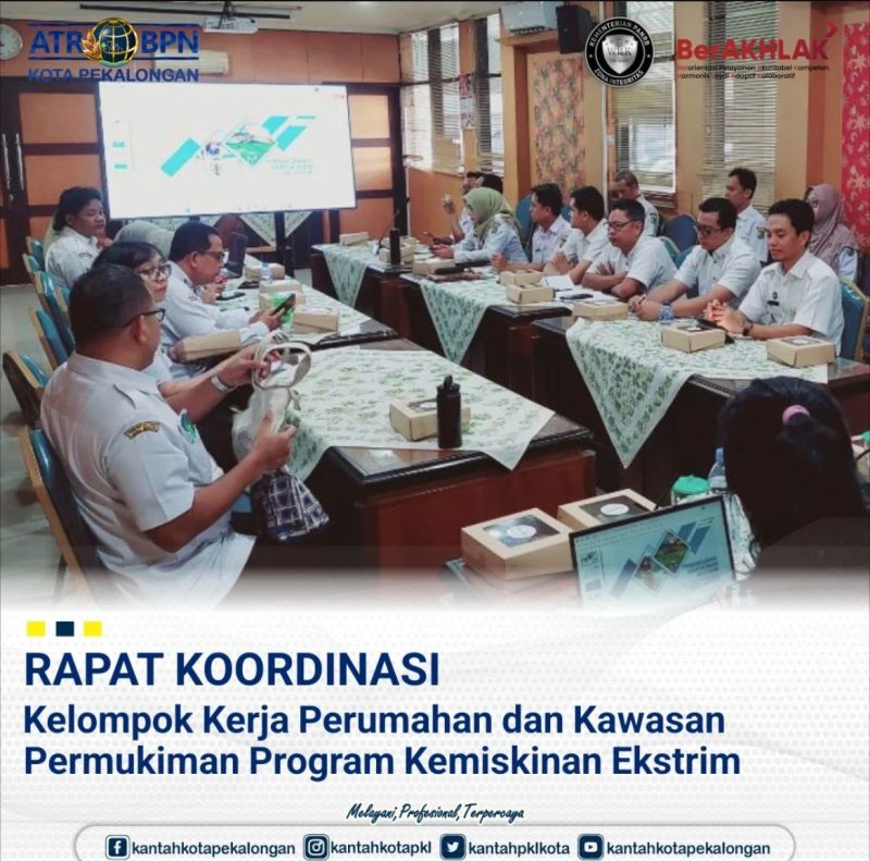 Rabu, 2 Juli 2025 Kepala Kantor Pertanahan Kota Pekalongan bersama dengan Kepala Seksi Survei dan Pemetaan serta Kepala Seksi Penataan dan Pemberdayaan menghadiri undangan rapat perihal koordinasi kelompok kerja perumahan dan kawasan permukiman program kemiskinan ekstrim, bertempat di Ruang Jawa Hokokai Sekretaris Daerah Kota Pekalongan.