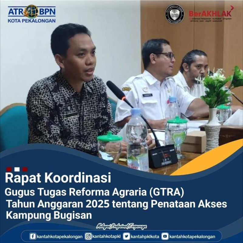 Pada hari Rabu, 23 Juli 2025 Kepala Kantor Pertanahan Kota Pekalongan bersama dengan Kepala Seksi Penataan dan Pemberdayaan menghadiri undangan dari Sekretariat Daerah Kota Pekalongan dalam rangka Rapat Koordinasi Gugus Tugas Reforma Agraria (GTRA) tahun anggaran 2025 tentang Penataan Akses Kampung Bugisan, Kelurahan Panjang Wetan, Kecamatan Pekalongan Utara.