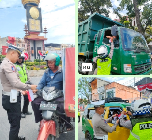 Selain membagikan bendera, petugas juga memberikan imbauan tertib berlalu lintas dengan cara yang ramah dan edukatif.