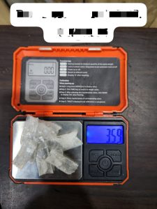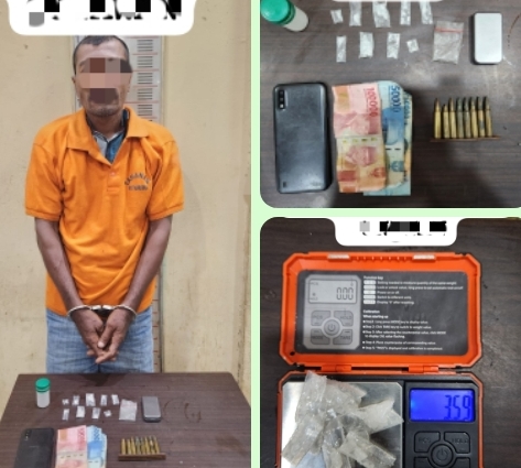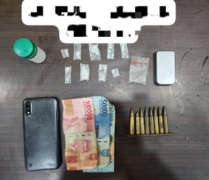Dari tangan terduga pelaku, petugas berhasil mengamankan barang bukti berupa 9 bungkus plastik klip bening yang diduga berisikan narkotika jenis sabu dengan berat bruto 3,59 gram, 1 plastik klip kosong, 1 botol plastik kecil, 1 timbangan elektrik, 8 butir amunisi, 1 unit handphone, serta uang tunai sebesar Rp200.000.