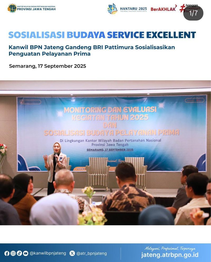 Semarang – Bagian Tata Usaha Kantor Wilayah Badan Pertanahan Nasional Provinsi Jawa Tengah menyelenggarakan kegiatan Monitoring dan Evaluasi Kegiatan Tahun 2025 serta Sosialisasi Budaya Pelayanan Prima dengan menggandeng BRI sebagai mitra. Acara ini dihadiri oleh jajaran pejabat struktural, pegawai Tata Usaha Kanwil BPN Jateng.