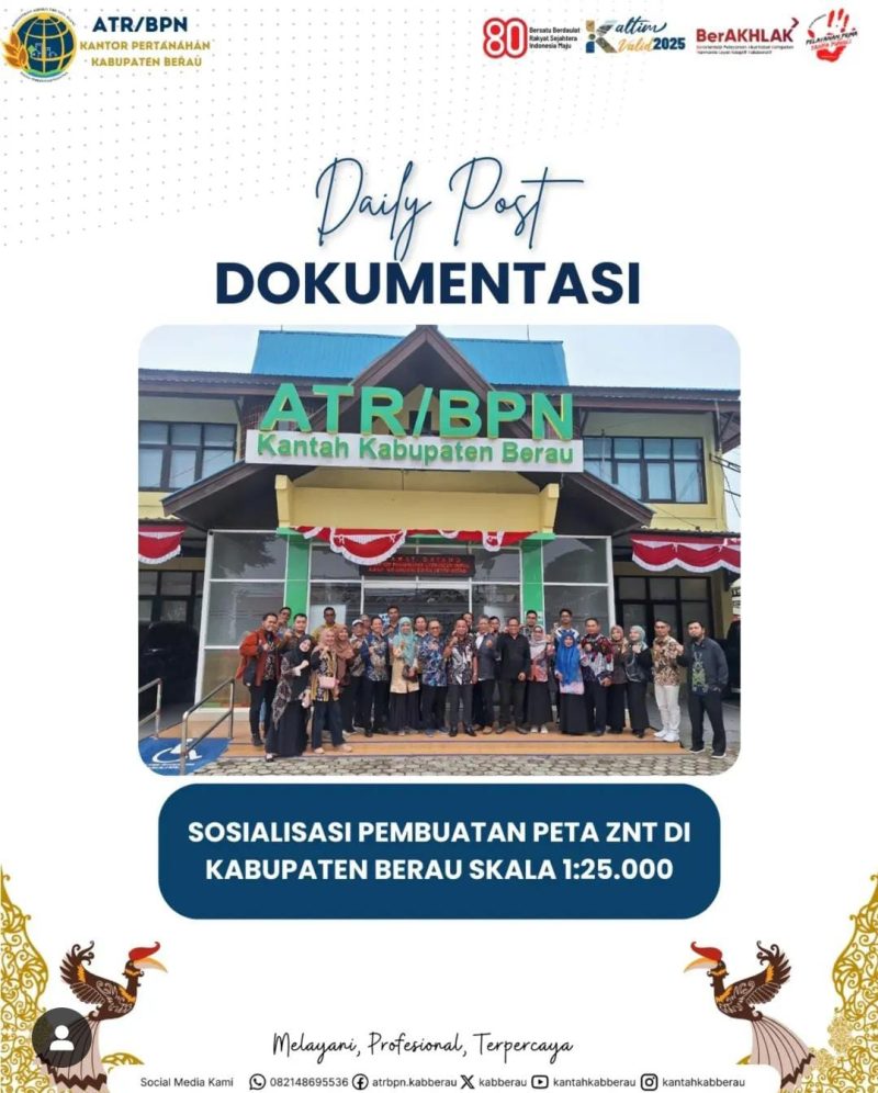 Halo #SobATRBPN (21/08) Dalam rangka mendukung transparansi dan akurasi dalam pelayanan pertanahan, Kantor Pertanahan Kabupaten Berau melaksanakan kegiatan Sosialisasi Pembuatan Peta Zona Nilai Tanah (ZNT) dengan skala 1:25.000 di wilayah Kabupaten Berau yang berlangsung di Ruang Rapat Kantor Pertanahan Kabupaten Berau, Kamis 21 Agustus 2025.