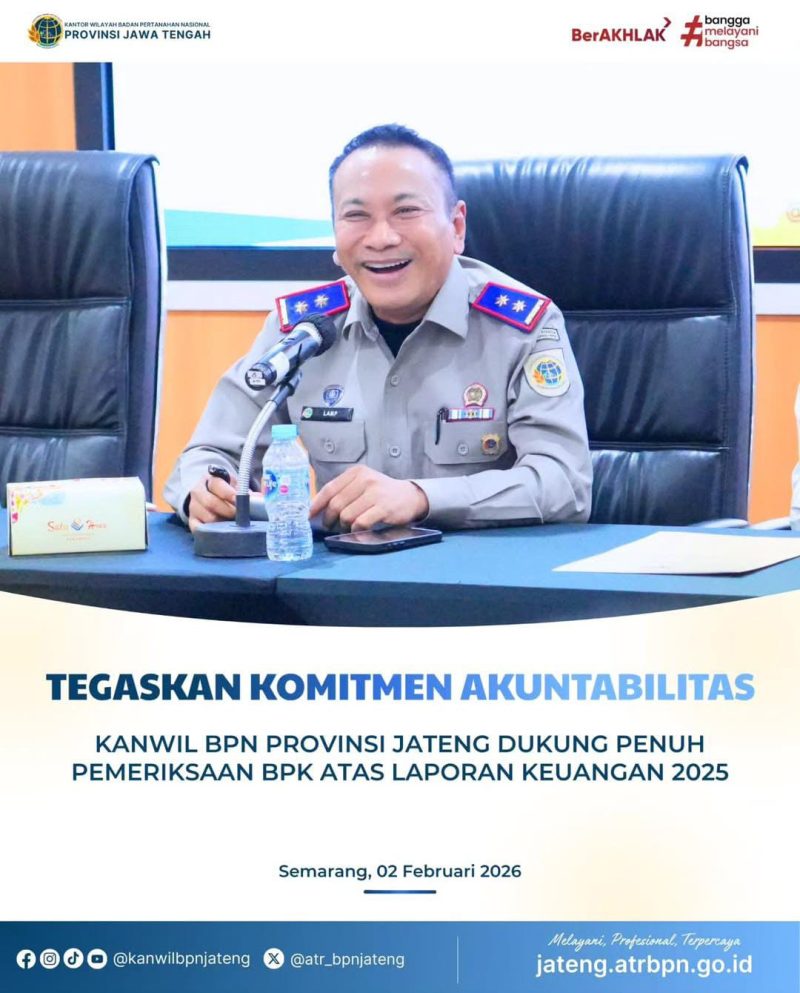 Semarang – Kantor Wilayah Badan Pertanahan Nasional Provinsi Jawa Tengah mengikuti kegiatan entry meeting pemeriksaan Laporan Keuangan Kementerian Agraria dan Tata Ruang/Badan Pertanahan Nasional Tahun 2025 yang dilaksanakan oleh Badan Pemeriksa Keuangan RI, Senin (02/02/2026). Kegiatan ini berlangsung di Aula Kanwil BPN Provinsi Jawa Tengah dan dihadiri oleh para Kepala Kantor Pertanahan kabupaten/kota se-Jawa Tengah.