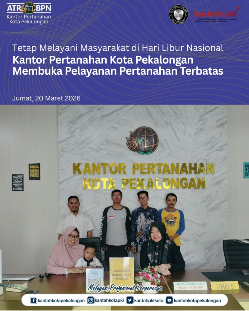 Kantor Pertanahan Kota Pekalongan melaksanakan Pelayanan Pertanahan Terbatas pada Kamis, 20 Maret 2026, sebagai bentuk komitmen dalam memberikan akses layanan kepada masyarakat, khususnya terkait informasi dan pemeliharaan data pertanahan.