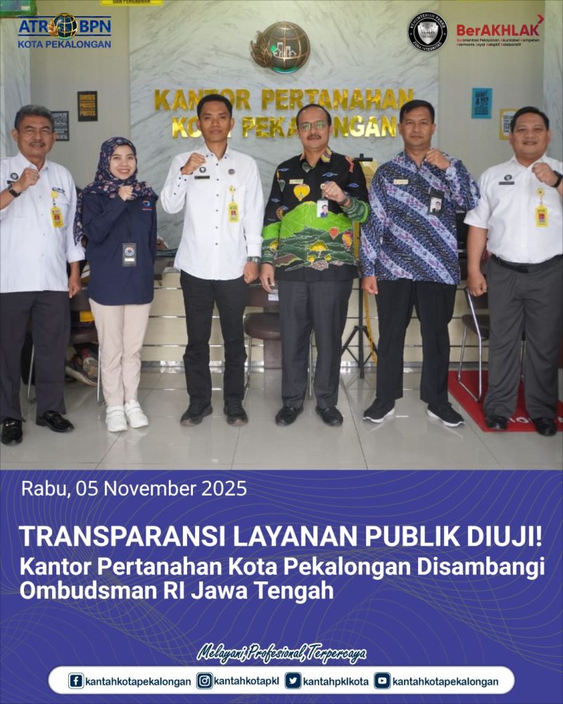Rabu, 5 November 2025 Upaya mewujudkan layanan pertanahan yang bersih dan profesional Kantor Pertanahan Kota Pekalongan kembali diuji. Hari ini menerima kunjungan dari perwakilan Ombudsman Republik Indonesia (ORI) Provinsi Jawa Tengah. Kunjungan tersebut bukan sekadar silaturahmi biasa, melainkan agenda dalam rangka Penilaian Maladministrasi Kegiatan Penyelenggaraan Pelayanan Publik (OPINI OMBUDSMAN 2025).