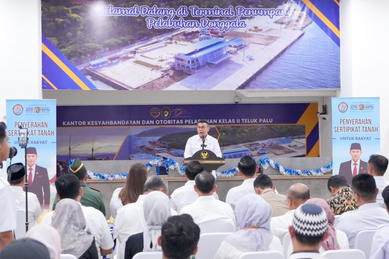Palu – Provinsi Sulawesi Tengah mencatatkan capaian positif dalam pelaksanaan program Pendaftaran Tanah Sistematis Lengkap (PTSL) sepanjang tahun 2025. Dari total target 5.494 bidang tanah yang tersebar di 13 kabupaten/kota, telah berhasil diselesaikan sebanyak 4.797 bidang atau sekitar 95,56%. Capaian ini disampaikan Wakil Menteri Agraria dan Tata Ruang/Wakil Kepala Badan Pertanahan Nasional (Wamen ATR/Waka BPN), Ossy Dermawan, dalam momen penyerahan 160 sertipikat tanah kepada masyarakat dan pemerintah daerah (Pemda) Sulawesi Tengah, di Terminal Penumpang Pelabuhan Donggala, Rabu (09/07/2025).